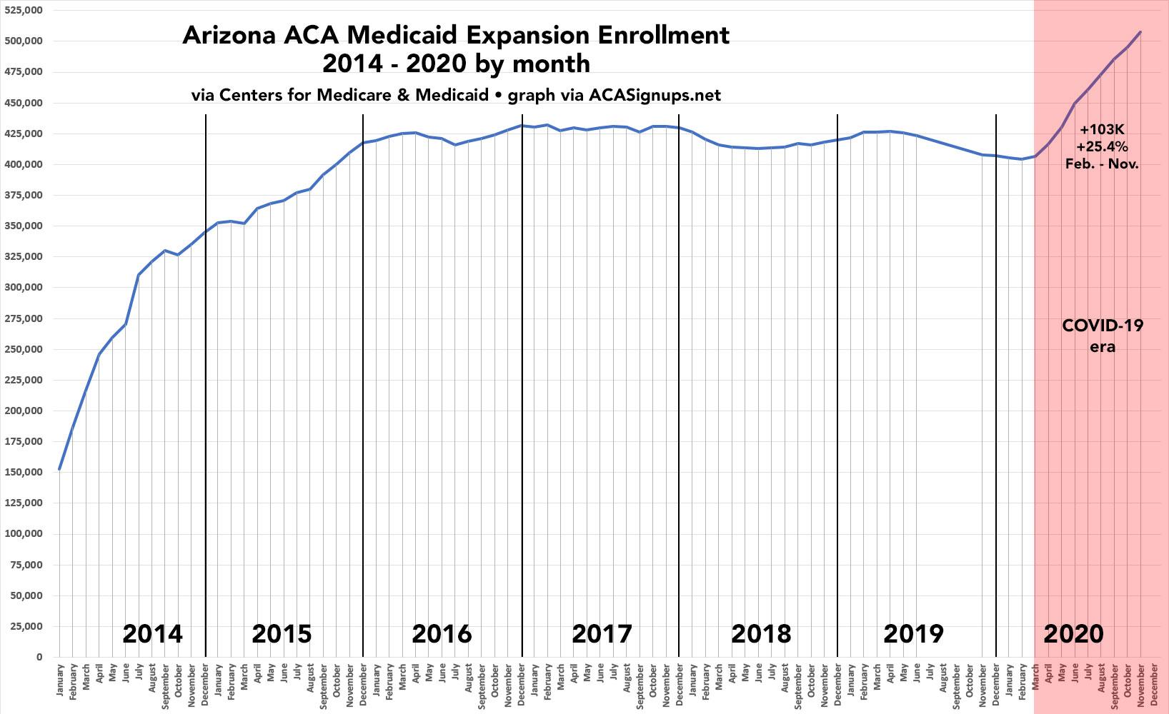 I've decided to take a closer look at individual states. The graph below shows how many Arizonans have been actively enrolled their Medicaid expansion program (awkward named the Arizona Health Care Cost Containment System, or AHCCCS):