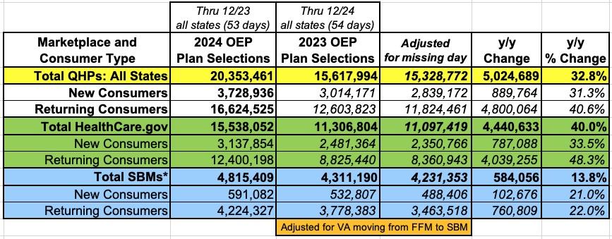 In mid-December, I posted an update to my 2024 ACA Open Enrollment Period projections in which I upgraded my prior estimate of 18.5 million QHPs + BHPs combined to more than 19 million total.