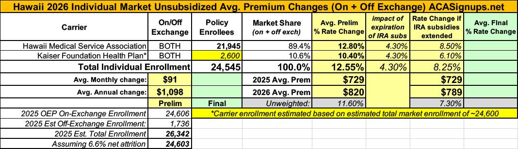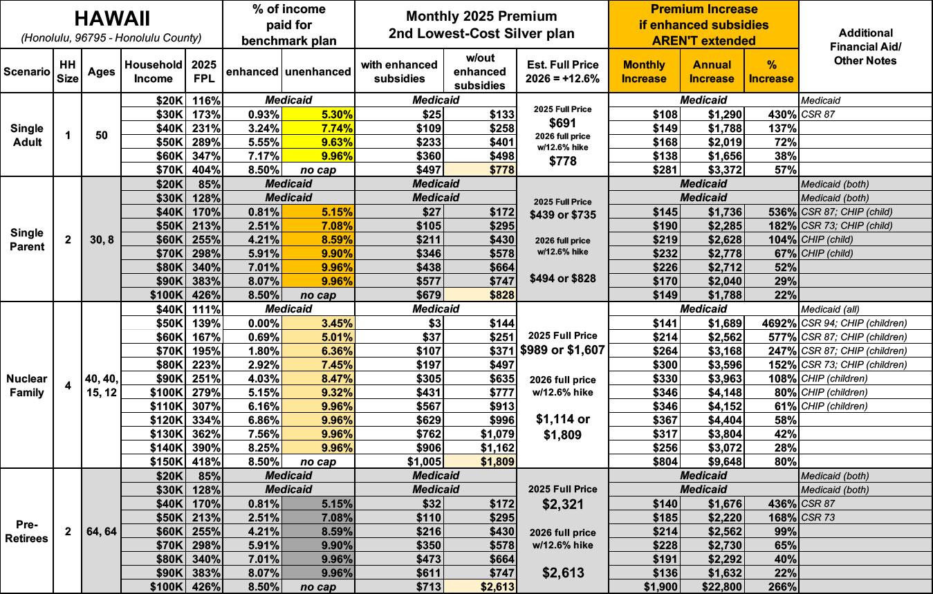 NEW: The original version of this analysis included a 4.3% increase in the unsubsidized benchmark plan premium based on a projection by the Congressional Budget Office. However, that was a national average projection which didn’t take into account other factors like increased utilization, medical inflation and so on. This updated version assumes the actual 2026 Hawaii rate filings which average 12.6% statewide.
