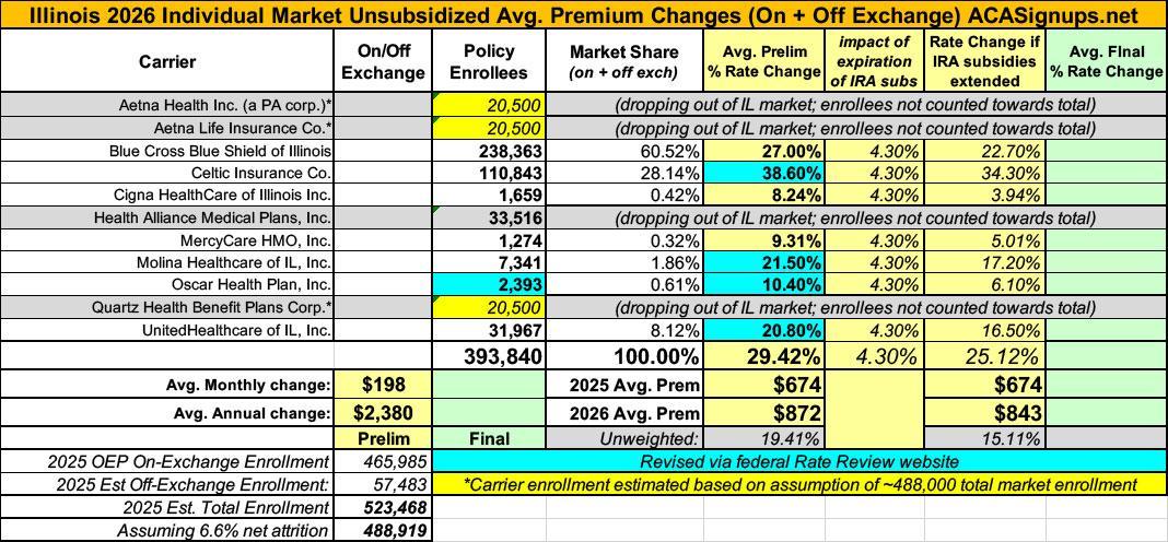 Illinois has around ~466,000 residents enrolled in ACA exchange plans, 90% of whom are currently subsidized. I estimate they also have another ~57,000 unsubsidized off-exchange enrollees.