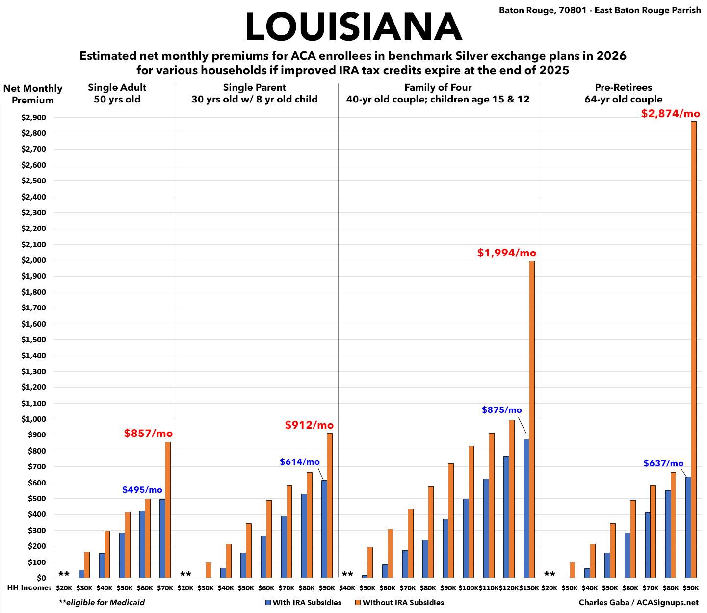 Louisiana has around ~293,000 residents enrolled in ACA exchange plans, 96% of whom are currently subsidized. I estimate they also have another ~13,000 unsubsidized off-exchange enrollees.