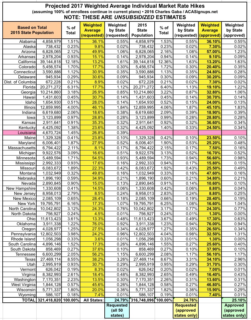 When you average all three methods together, the weighted UNSUBSIDIZED approved rate hike average for EVERY state except for Louisiana comes in at 25.1%: