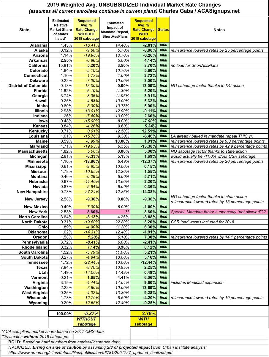 As I noted a few days ago, now that the 2019 ACA Open Enrollment Period is actually underway and the approved individual market premium rate changes have been posted publicly for every state, I'm finally able to go back and wrap up my 2019 Rate Hike Project for the nine states which I was still missing final numbers for.