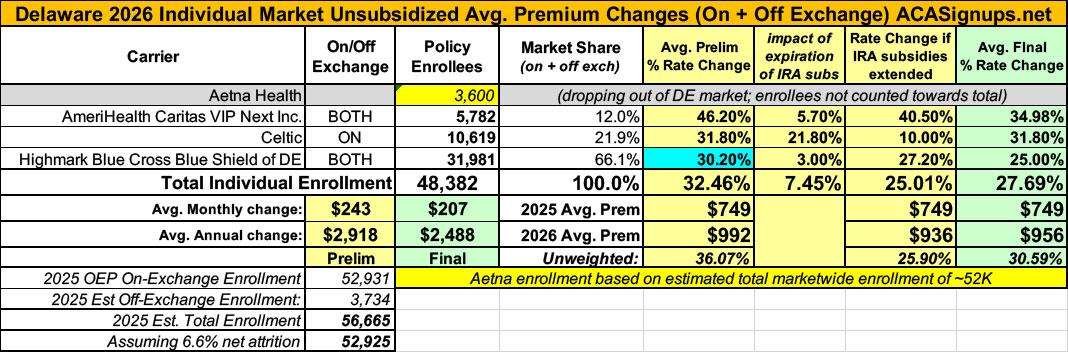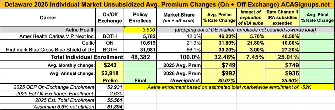 UPDATE 8/28/25: The Delaware Insurance Dept. has posted their approved rate changes for the individual market; they knocked AmeriHealth Caritas down by over 11 points and shaved 5 points off of Highmark, bringing the final weighted average increase down from 32.5% to 27.7%.