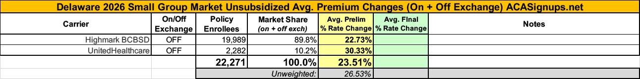 Meanwhile, things aren't looking much better for the ~22,000 Delaware residents enrolled in small group plans. The small group market usually only sees relatively modest single-digit rate hikes every year, but 2026 is looking pretty ugly in the Diamond State: