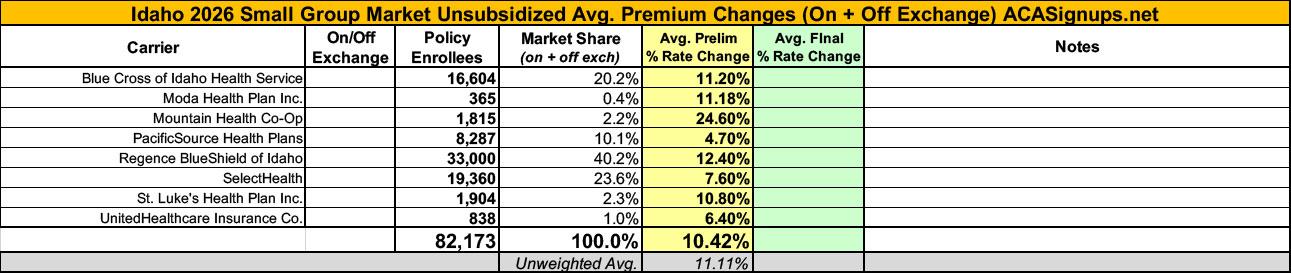 UPDATE 10/01/25: The Idaho Insurance Dept. has published the final/approved 2026 rate filings for both the individual & small group markets.