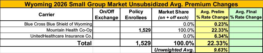 UPDATE 8/14/25: As explained in more detail here, Mountain Health Co-Op just announced they're dropping out of the Wyoming market entirely after all, meaning their ~9,600 enrollees will have to choose one of the other carriers. This also means the weighted average rate increase drops by several points to 21.7%. I've updated the table below to reflect this: