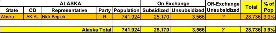 Alaska has around ~28,000 residents enrolled in ACA exchange plans, 88% of whom are currently subsidized. They also have an unknown number of off-exchange enrollees in ACA-compliant individual market policies. Overall, including net attrition, I estimate their total enrollment both on & off exchange to be perhaps ~27,000 or so.