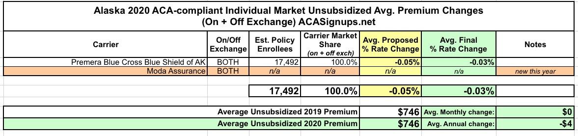 When I ran the preliminary 2020 rate changes for unsubsidized ACA policies in Alaska back in August, it was pretty easy to do...there's only a single carrier offering ACA-compliant individual market policies for 2019, which means no weighting is required. Furthermore, Premera Blue Cross Blue Shield is basically keeping their rates flat for 2020 anyway.