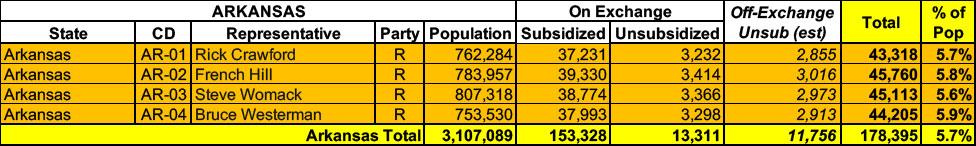 Arkansas has around 166,000 residents enrolled in ACA exchange plans, 92% of whom are currently subsidized. I estimate they also have perhaps another ~11,000 unsubsidized off-exchange enrollees.