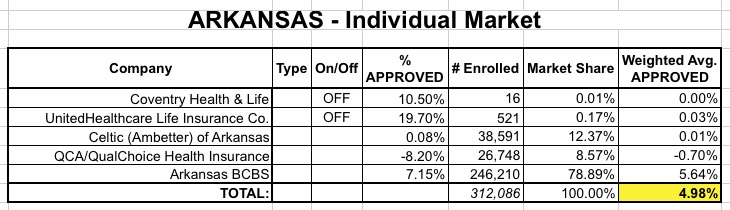 So just last Friday I posted the weighted average requested rate hikes for the Arkansas individual market; it came in at 14.9% overall, which is actually one of the lower statewide averages this year. As a reminder, here's what how the breakout looks: