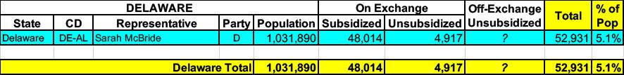 Delaware has ~53,000 residents enrolled in ACA exchange plans, 91% of whom are currently subsidized. They also have an unknown number enrolled in off-exchange plans. Overall, with net attrition, I estimate current total enrollment is down a bit to perhaps 52,000 today.