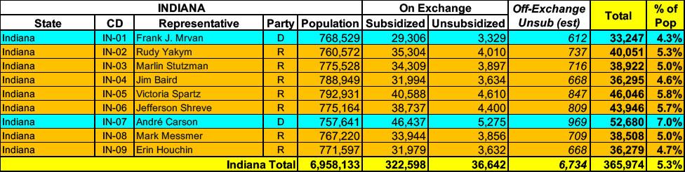 Indiana has around 359,000 residents enrolled in ACA exchange plans, 90% of whom are currently subsidized. I estimate they also have another ~6,700 unsubsidized off-exchange enrollees