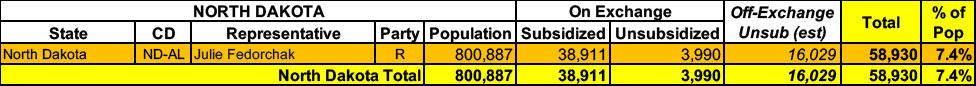 North Dakota has around ~43,000 residents enrolled in ACA exchange plans, 91% of whom are currently subsidized. I estimate they also have another ~16,000 unsubsidized off-exchange enrollees.