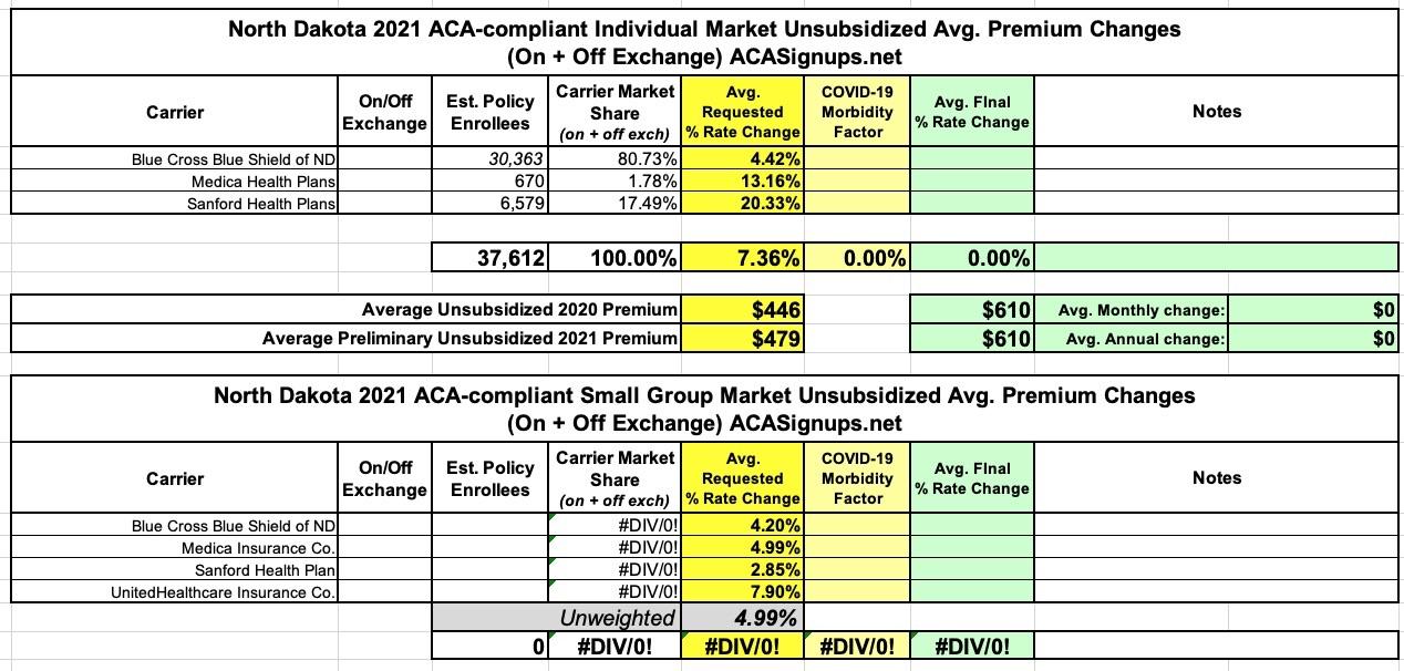 Here's North Dakota's 2021 individual & small group market rate change filings. Note that all of the small group filings are heavily redacted and the memos aren't available in the SERFF database for any of them, so I can't run a weighted average and had to go with the unweighted 5.0% increase.