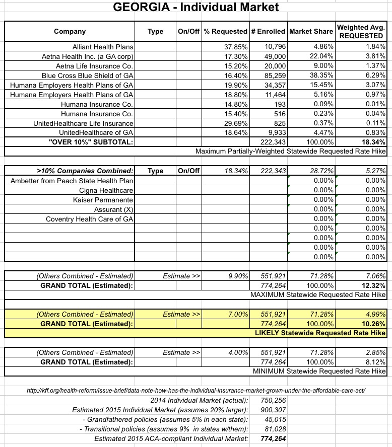 As explained in the first link above, I've still been able to piece together rough estimates of the maximum possible and mid-range requested average rate increase for the Georgia individual market:
