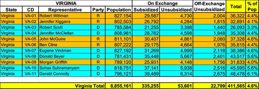 Virginia has ~388,000 residents enrolled in ACA exchange plans, 86% of whom are currently subsidized. They also have over 22,000 off-exchange enrollees. Combined, that's 411,000 people with ACA market coverage, or 4.6% of the total population.